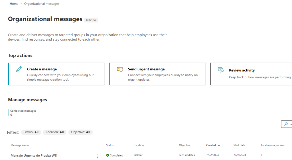 Puedes acceder al portal de menajes de la organización desde el siguiente enlace: Organizational messages – Microsoft 365 admin center